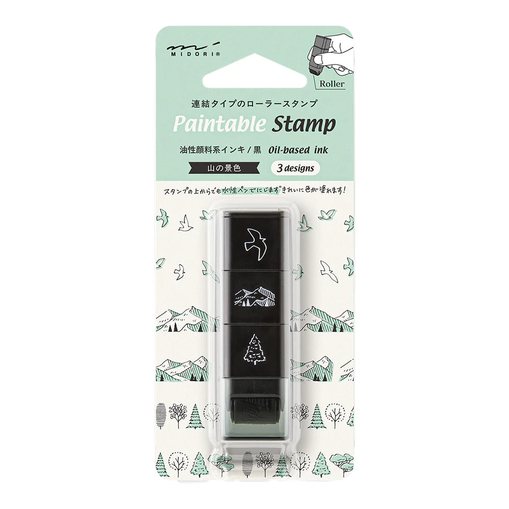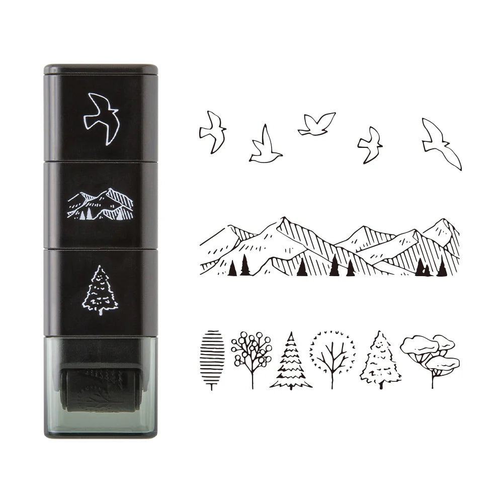 Bring serene landscapes to your pages with the Midori Paintable Stamp Roller - Mountain View. This roller-style stamp features three beautifully coordinated motifs—mountains, trees, and birds in flight—allowing you to craft peaceful, natural scenes directly in your planner, journal, or notebook.