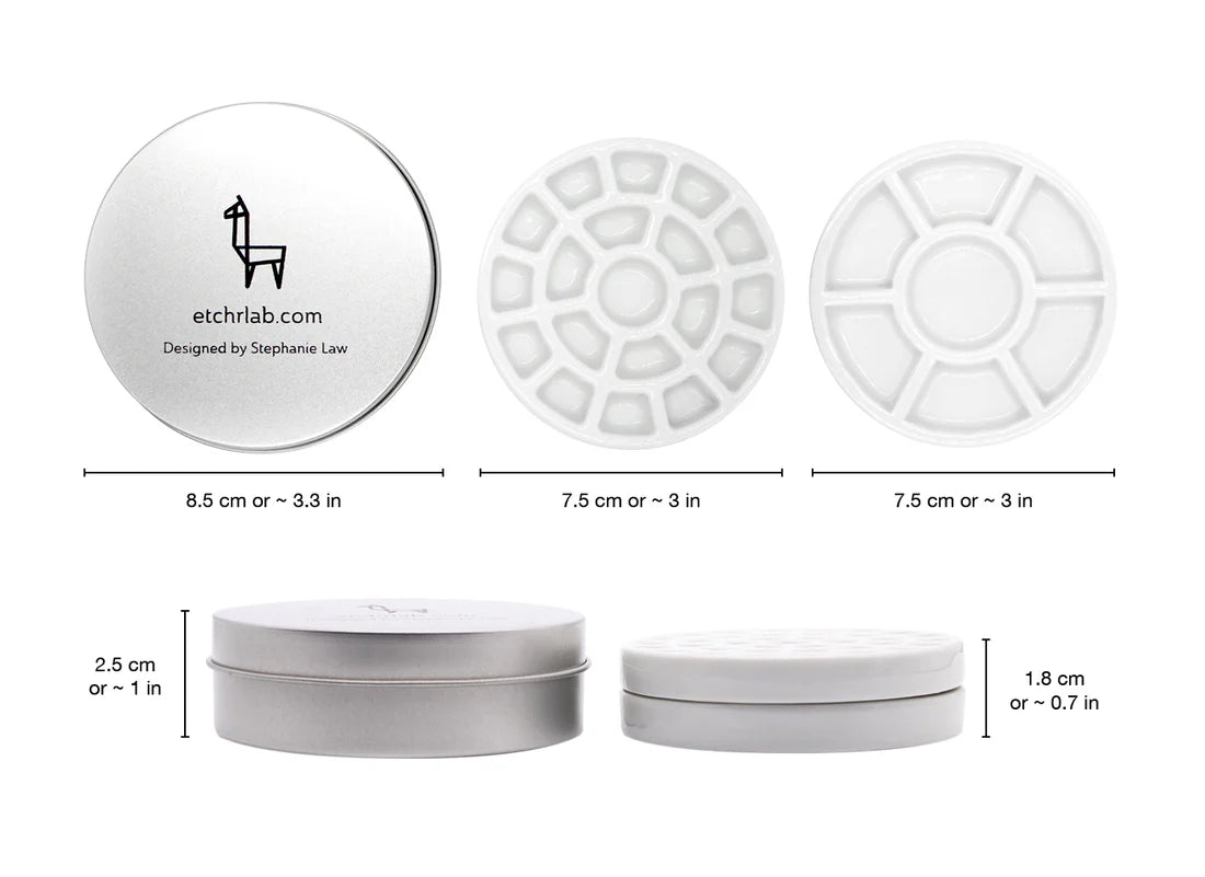 This three-inch, 6mm deep porcelain kit comes in a 19 or 37 well versions (select from the drop-down menu) and it has twin seven-segment mixing well. The set fits perfectly in an Etchr branded tin container.