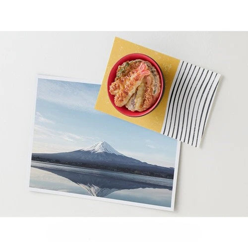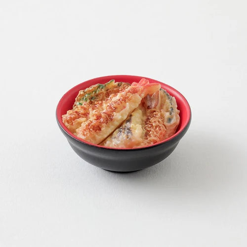 This Tendon magnet showcases crispy tempura shrimp and vegetables drizzled with savory sauce over a bed of white rice in a traditional red bowl.