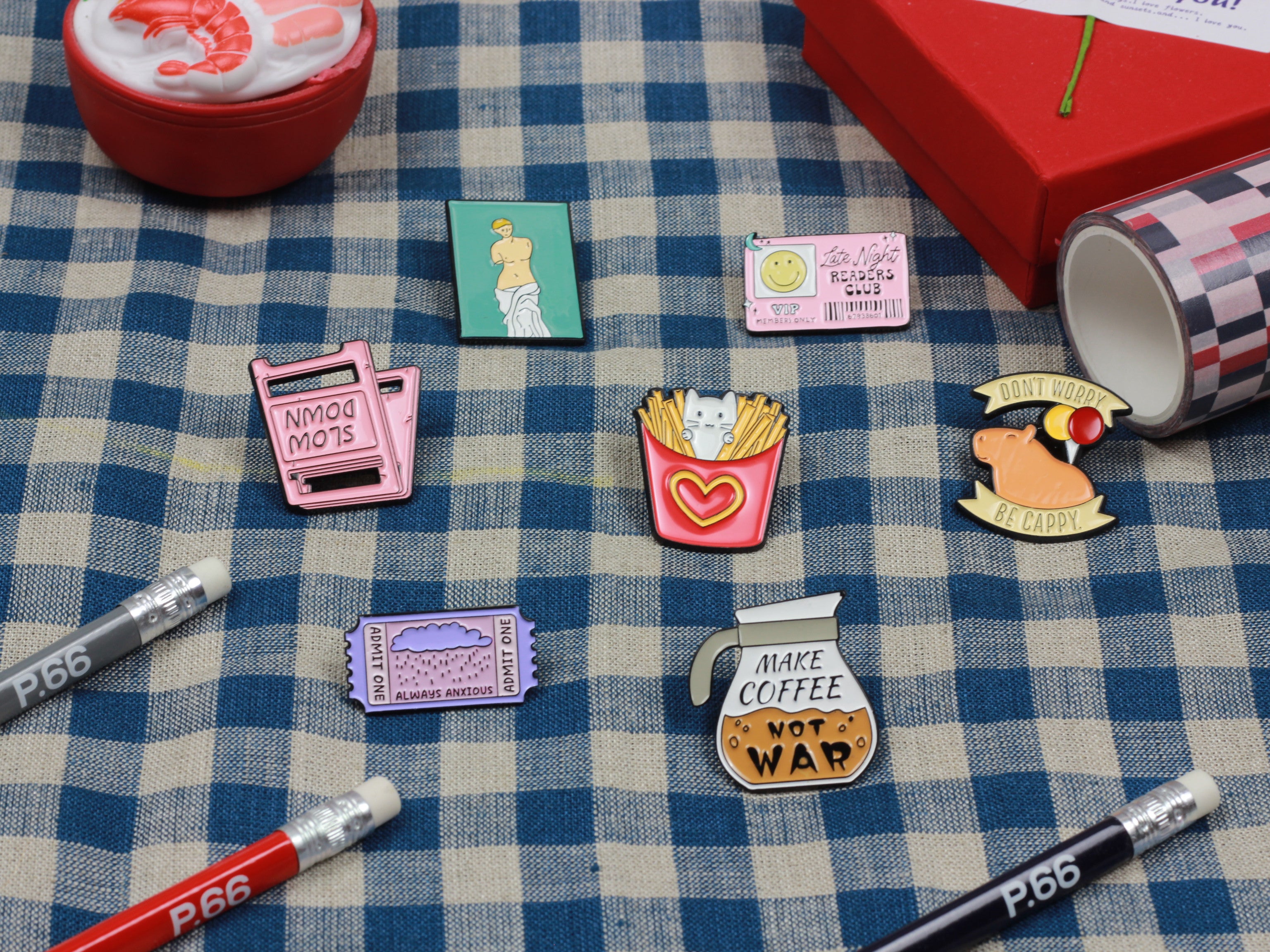 Dyed black pin with sturdy pin is suitable for pencil and pen case, pouch, bag, tote, hat and cap and etc.